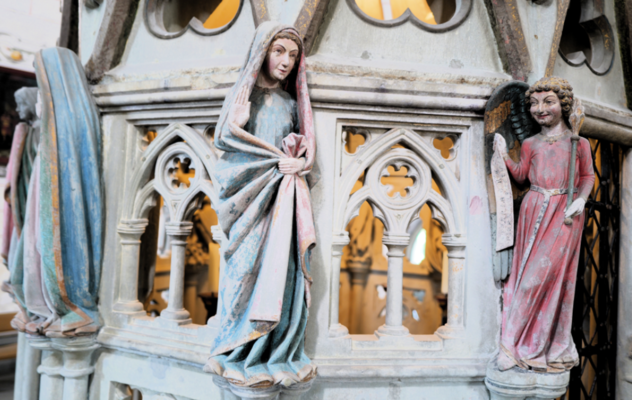 Für meine erste Weihnachtskarte als Bischof habe ich ein Bild aus der Mauritius-Rotunde in Konstanz ausgewählt. Die Bildergeschichte rund um das Heilige Grab (aus der Zeit um 1260) beginnt mit der Verkündigung, der Begegnung zwischen dem Erzengel Gabriel und Maria. Mit ganzem Einsatz, mit seinem offenen und heiteren Gesicht wirbt Gabriel für die Frohe Botschaft. Maria scheint zuerst wenig begeistert. Sie hebt abwehrend die Hand. Beim nächsten «Bild» der Rotunde sieht man, wie sie nun selbst mit charmantem Gesicht bei Elisabeth anwirbt. Ja, so kann es gehen!